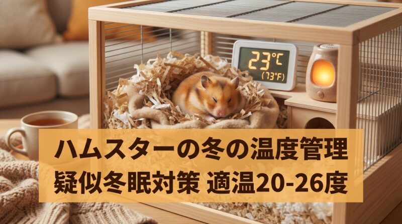 ハムスターの冬の温度管理は、適温20-26℃、湿度40-60%を維持することが基本です。疑似冬眠という命に関わる危険を防ぐためにも、温湿度計を設置して常にケージ内環境をチェックし、ペットヒーターや保温電球などの保温器具を適切に活用することが重要です。
