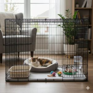 ケージの活用シーンは主に3つあります。第一に新入り猫の隔離期間です。新しい猫を迎えた際、いきなり既存の猫と同じ空間に放つのではなく、最初の1〜2週間はケージ内で過ごさせ、徐々に慣らしていくことで、喧嘩やストレスを最小限に抑えられます。
